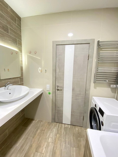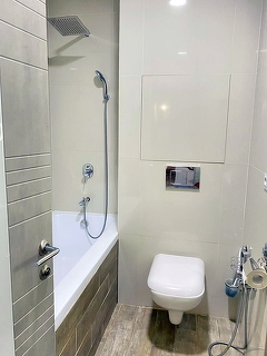 Увеличили с/у поместилась полноценная ванна. Подвесной унитаз, водонагреватель на 80л (очень удобно и экономично).